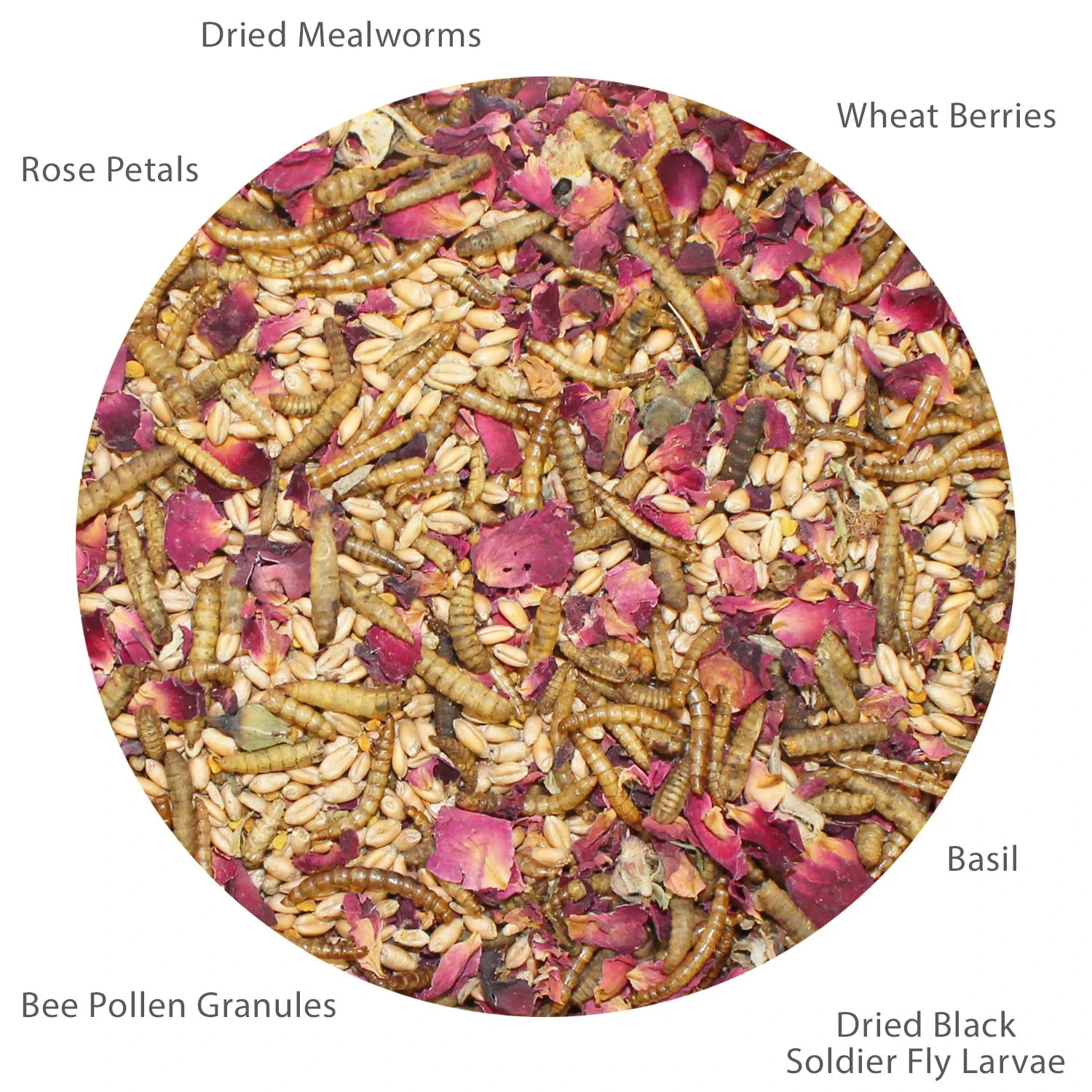 INGREDIENTS: dried black soldier fly larvae, dried mealworms, wheat berries, basil, rose flowers, bee pollen granules.