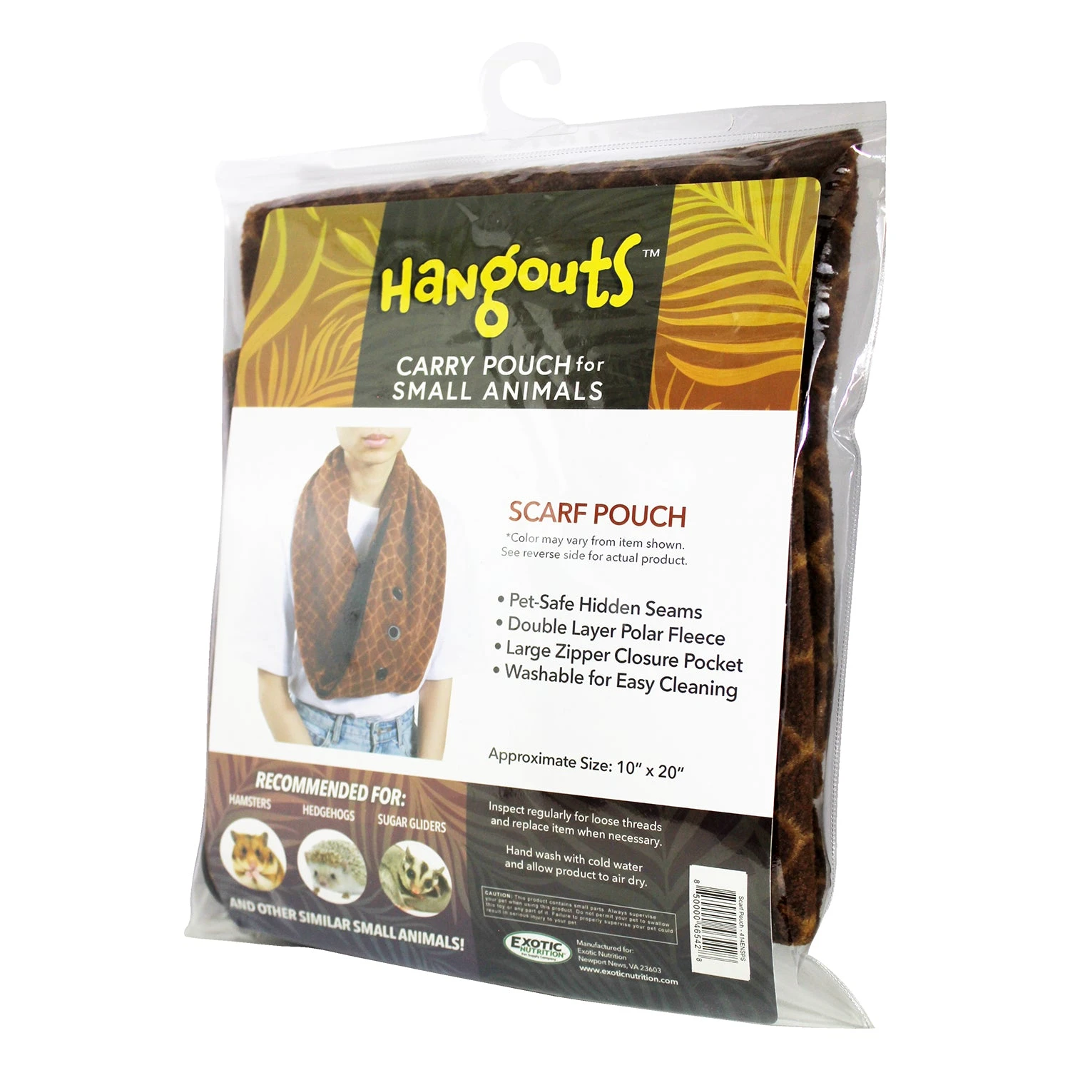 Exotic Nutrition’s Bonding Scarf Pouch from the Hangouts collection is the most stylish and pet-friendly accessory you can wear this winter season! Your pet can snuggle up inside and be on the go with you. The huge inner pouch is 16″ x 8″, creating plenty of space for your pet. The discrete air holes on the sides allow for ample airflow while the convenient zipper closure provides complete access to your pet. Its durable construction helps ensure pet’s safety, comfort, and security. Double layered fleece creates hidden seams which prevent loose threads – the safest option for your pet! Designed for sugar gliders, hedgehogs, prairie dogs, chinchillas, squirrels, rats, opossums, degus, hamsters/gerbils, and other small pets.