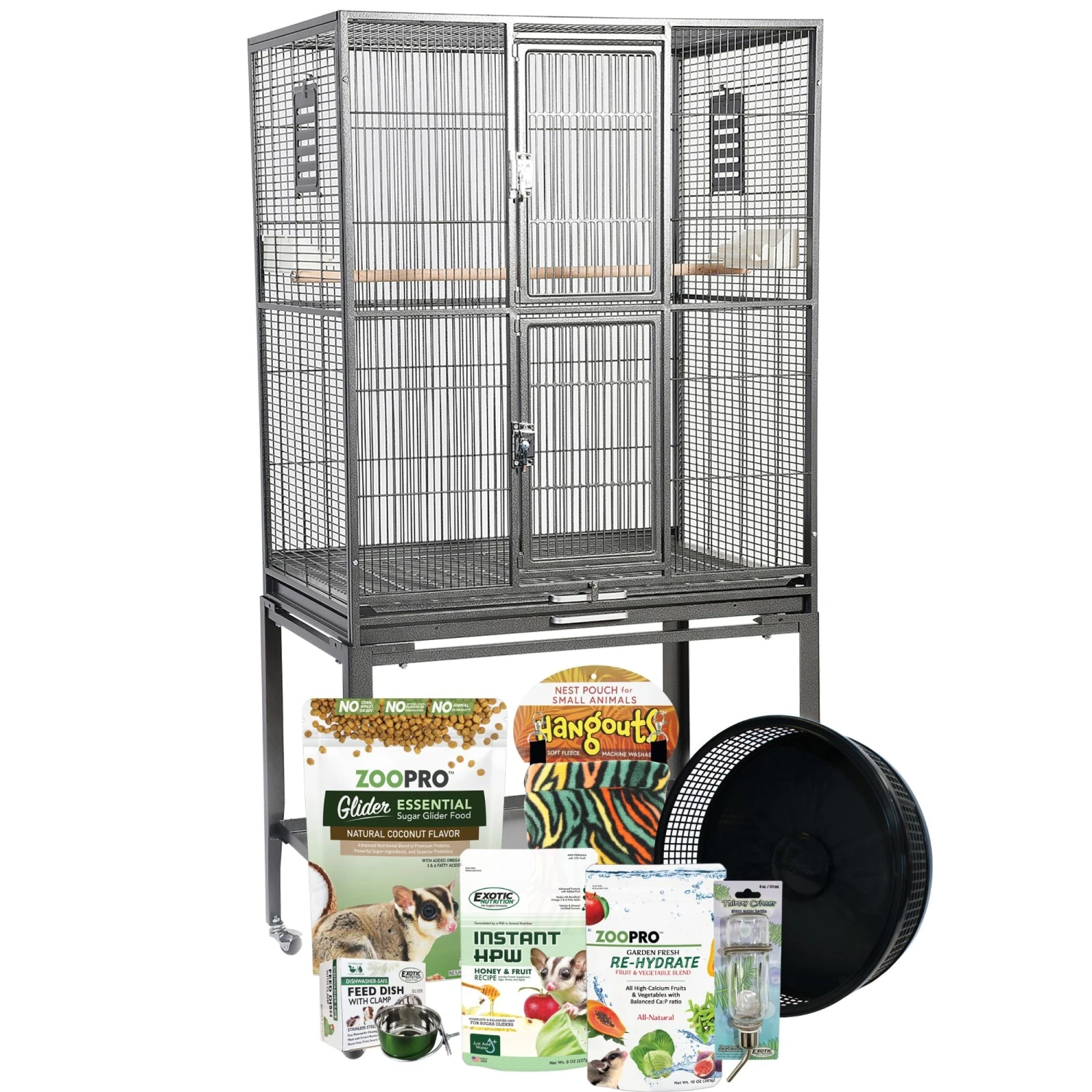 Perfect for new sugar glider owners, this complete starter package includes all the essential items you need for caring for your pet. With the high-quality Silent Runner PRO exercise wheel, Deluxe Nest Pouch, ZooPro Glider Essential food, Instant-HPW food, Garden Fresh Re-Hydrate fruits & vegetables, as well as a stainless steel feed dish and hanging water bottle, you can rest easy knowing your sugar glider is receiving the best nutrition and care.