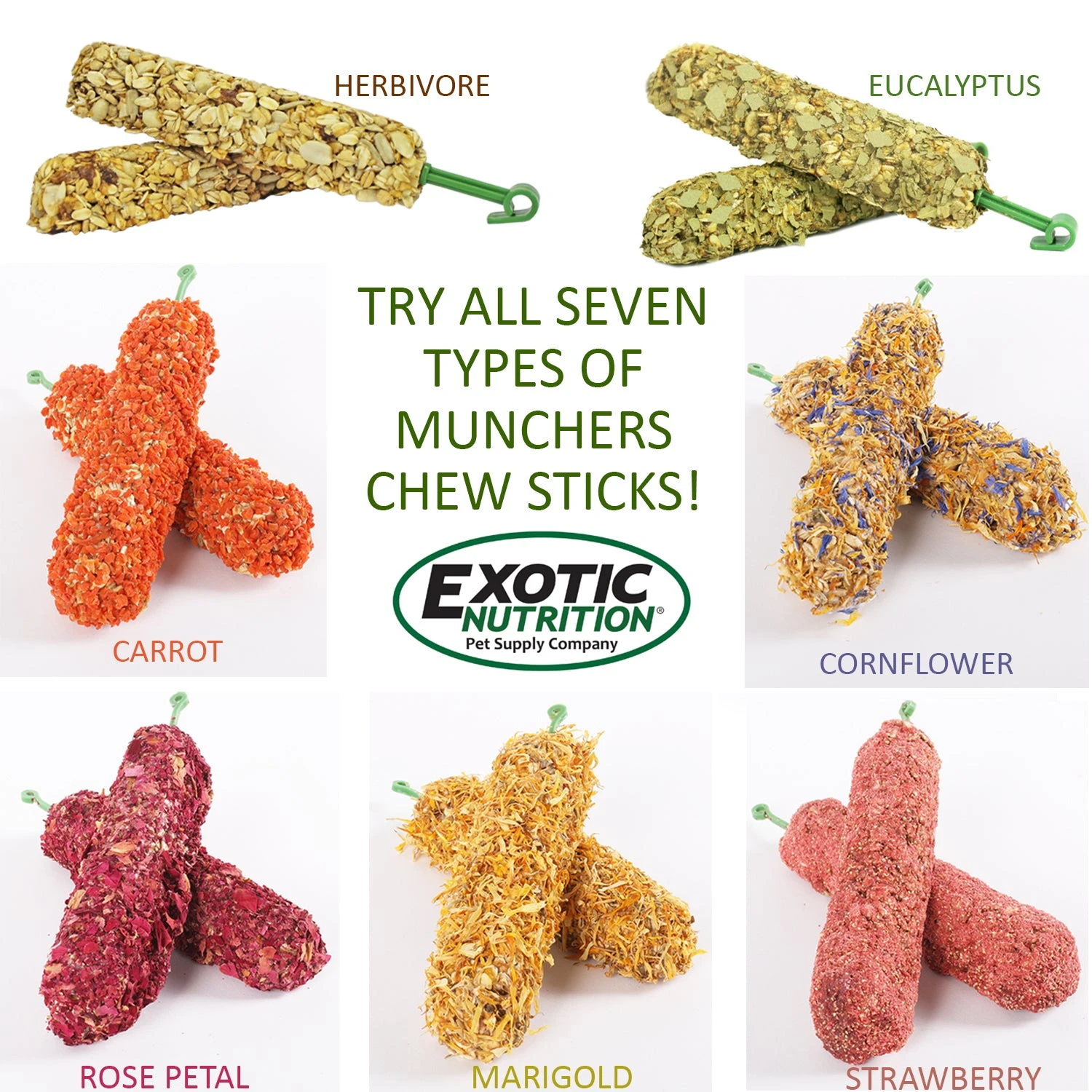 Provide your pet with a fun and tasty treat loaded with natural and healthy ingredients. Exotic Nutrition Munchers Chew Sticks with Marigold are ready-to-feed stick treats made with an assortment of high-quality grains such as barley and oatmeal to satisfy your companion’s love for natural and crunchy goodness! Each stick is double baked for a nice texture to help fulfill your pet’s gnawing instincts and encourages healthy teeth. This treat provides hours of chewing even after the tasty outer layers are gone! Ideal for: Rabbits, Guinea pigs, Hamsters, Chinchillas, Degus, mice, rats, and other small animals.