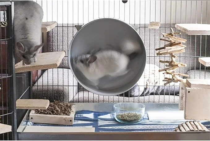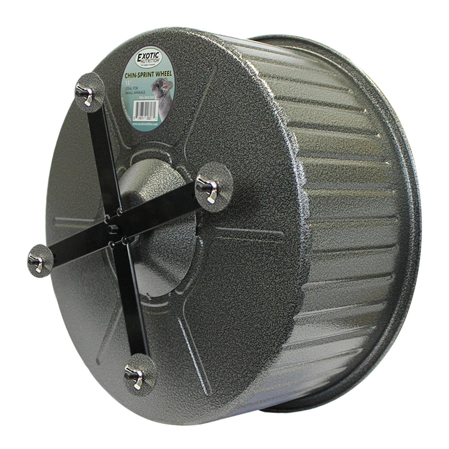 The Chin-Sprint is the first and only exercise wheel on the market of its kind. Durable all-metal construction, mountable, and featuring an open-faced design with extra-wide running track. A single unit of heavy-gauge steel is pressed into shape, no seams or joints to cause injury. Huge 15” diameter prevents curvature of the spin, while axle-free construction eliminates risk of tail entanglement. The rolling ball bearing engineering ensures the wheel spins smooth and quietly. Mounts to most wire cages, finished with a pet-safe powder coat. This heavy-duty wheel is completely chew-proof. Ideal for Chinchillas, Prairie Dogs, Rats, Opossums, Degus, Squirrels, and other small mammals.