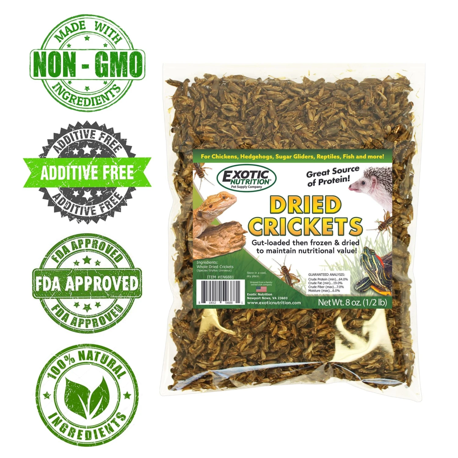Exotic Nutrition’s Dried Crickets 8 oz. are gut-loaded dried crickets that are first frozen, then freeze dried to maintain their nutritional value. A great source for protein … and they store for a year or longer without refrigeration. Excellent for Sugar Gliders, Hedgehogs, Wild Birds, Chickens, Turtles, Tropical fish, Reptiles, and other insect eating animals. No refrigeration necessary!