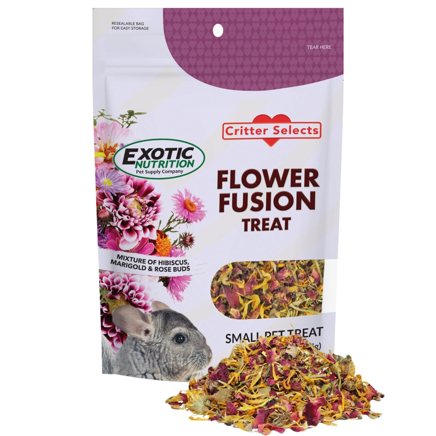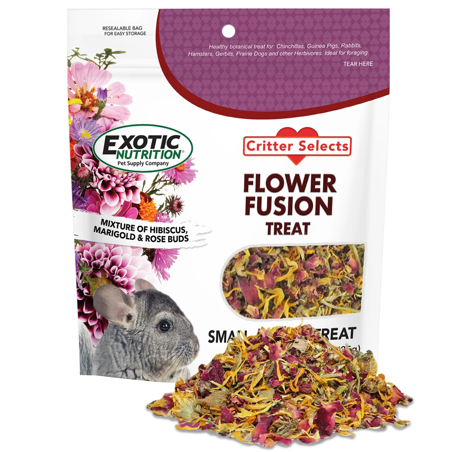 This treat is a blend of 3 types of organic dried flowers including Rose Petals, Calendula flowers, and Hibiscus flowers. Flowers are a tasty and healthy supplementary food because they have a low energy content, but contain plenty of fiber which makes them the ideal treat for your pet. Dried flowers are a favorite food of herbivores like Degus, Prairie Dogs, Chinchillas, Squirrels, Rabbits, Guinea Pigs, and other herbivores. These animals feed on grasses, flowers, seeds, bark, and roots in the wild.