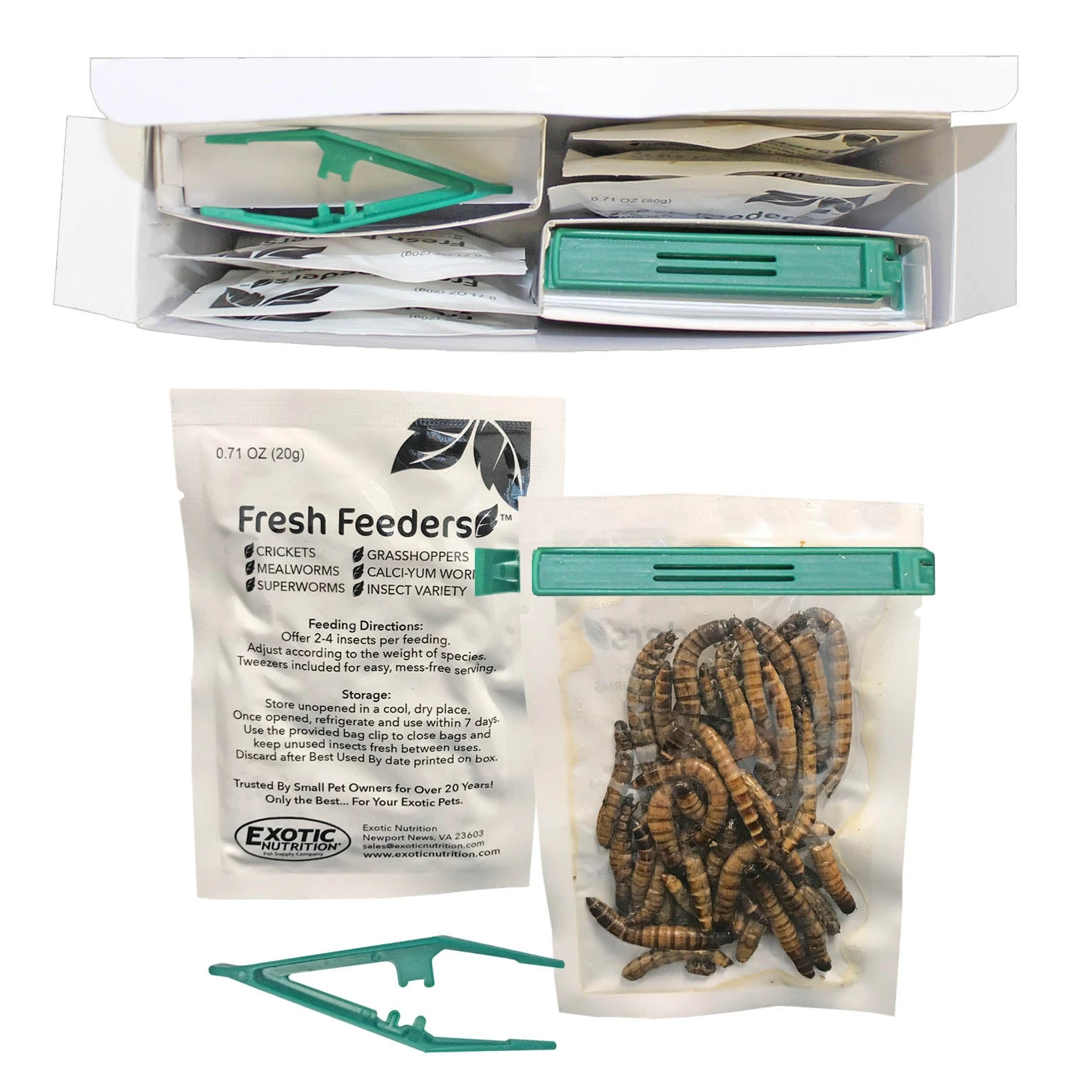 Exotic Nutrition’s Fresh Feeders provide freshly packaged moist insects that are sterilized (cooked) then packaged in convenient pouches for your easy feeding. Farm-raised, all-natural insects contain no preservatives and are easily digested. Each box contains six individual pouches that can be re-sealed (bag clip included) for easy storage. Ideal supplemental food source for Sugar Gliders, Hedgehogs, Squirrels, Turtles, Tropical fish, Reptiles, and Amphibians. Comes with feeding tweezer too!