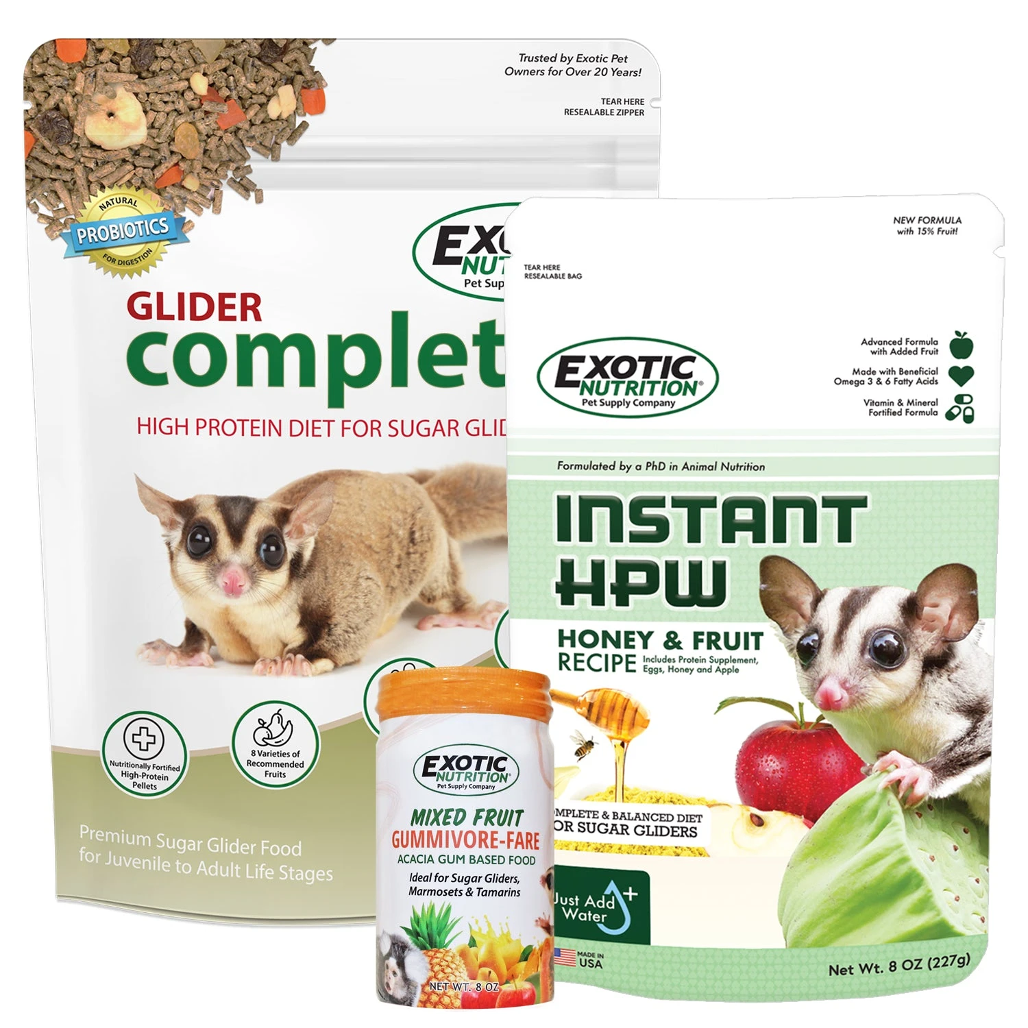 New sugar glider owner or just looking to change your pet’s diet? Here is a deluxe food starter package- everything that you need to begin feeding your glider a healthy, complete diet. Contains: Glider Complete 2 lb. pellets, Instant-HPW 8 oz. fresh diet, and Gummivore-fare 8 oz. jar acacia based supplemental food.