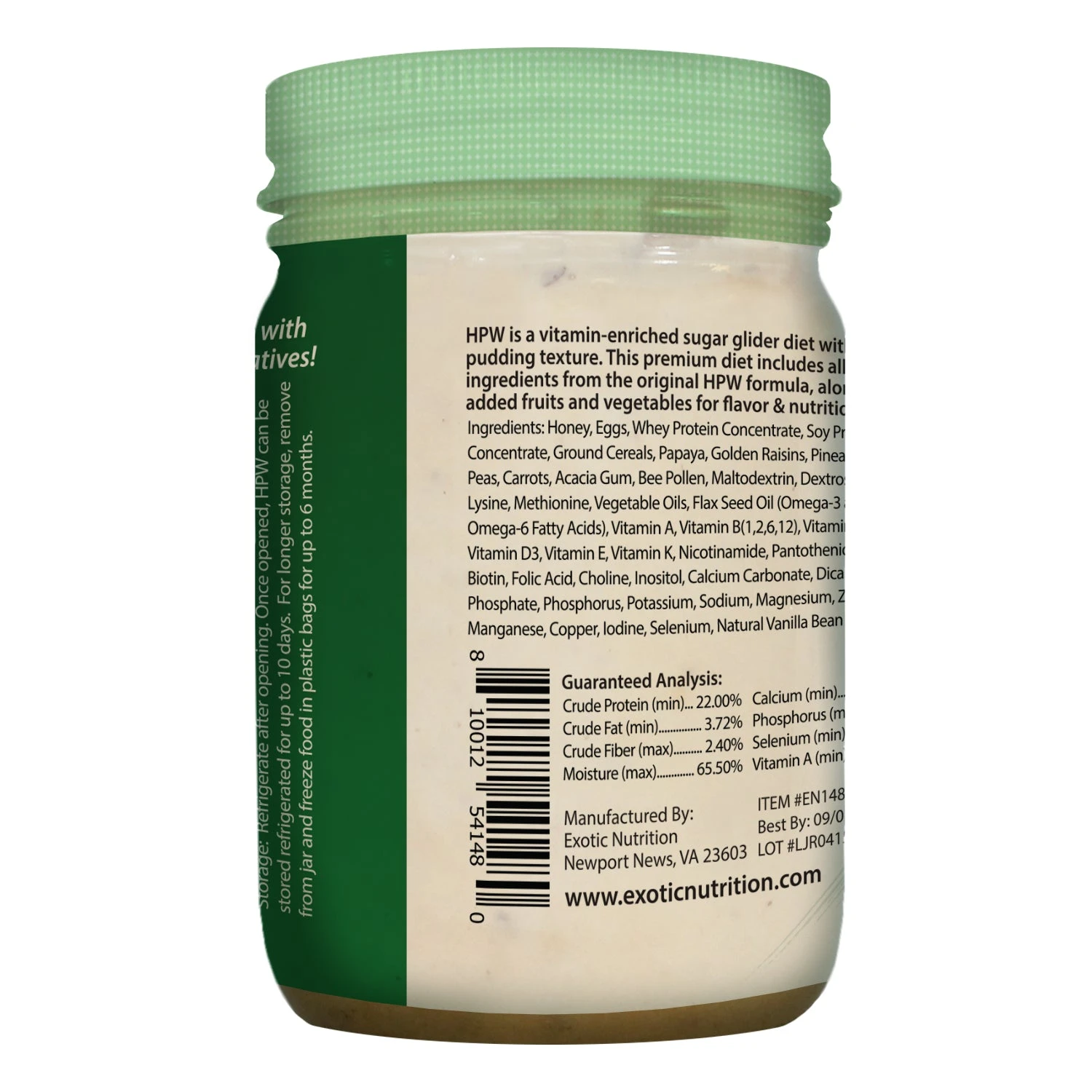 HPW is a vitamin-enriched diet with a soft, pudding-texture. This diet includes all the major ingredients from the original High Protein Wombaroo diet that is trusted and fed to sugar gliders worldwide. Sugar gliders love the vanilla bean flavoring and ingredients including honey, eggs, bee pollen and ZooPro high protein supplement. Amazingly simple, ready-to-serve out of the jar; no more spending mass amounts of money or time feeding your glider. HPW can be served fresh or frozen into individual servings using ice trays.