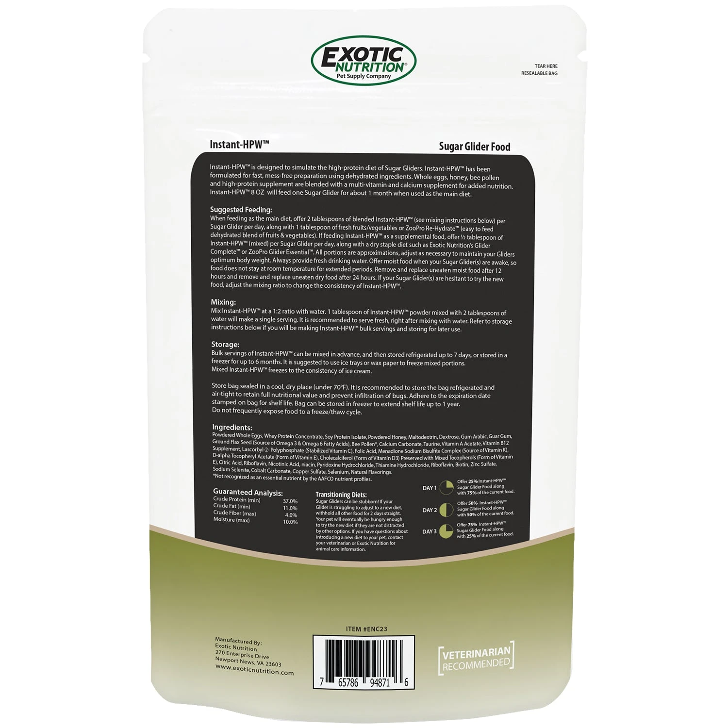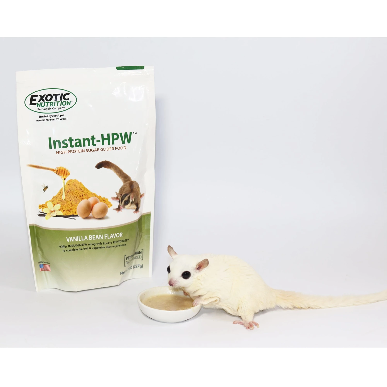 Exotic Nutrition’s Instant-HPW Original (Vanilla Bean flavor) was formulated to be a nutritious diet for pet sugar gliders. Wholesome natural ingredients such as eggs, honey, and whey protein are blended with essential vitamins and minerals into an easy-to-mix powder. Simply add water, mix, and offer to your pet. Instant-HPW contains the recommended nutrition necessary for proper growth and development of pet sugar gliders.