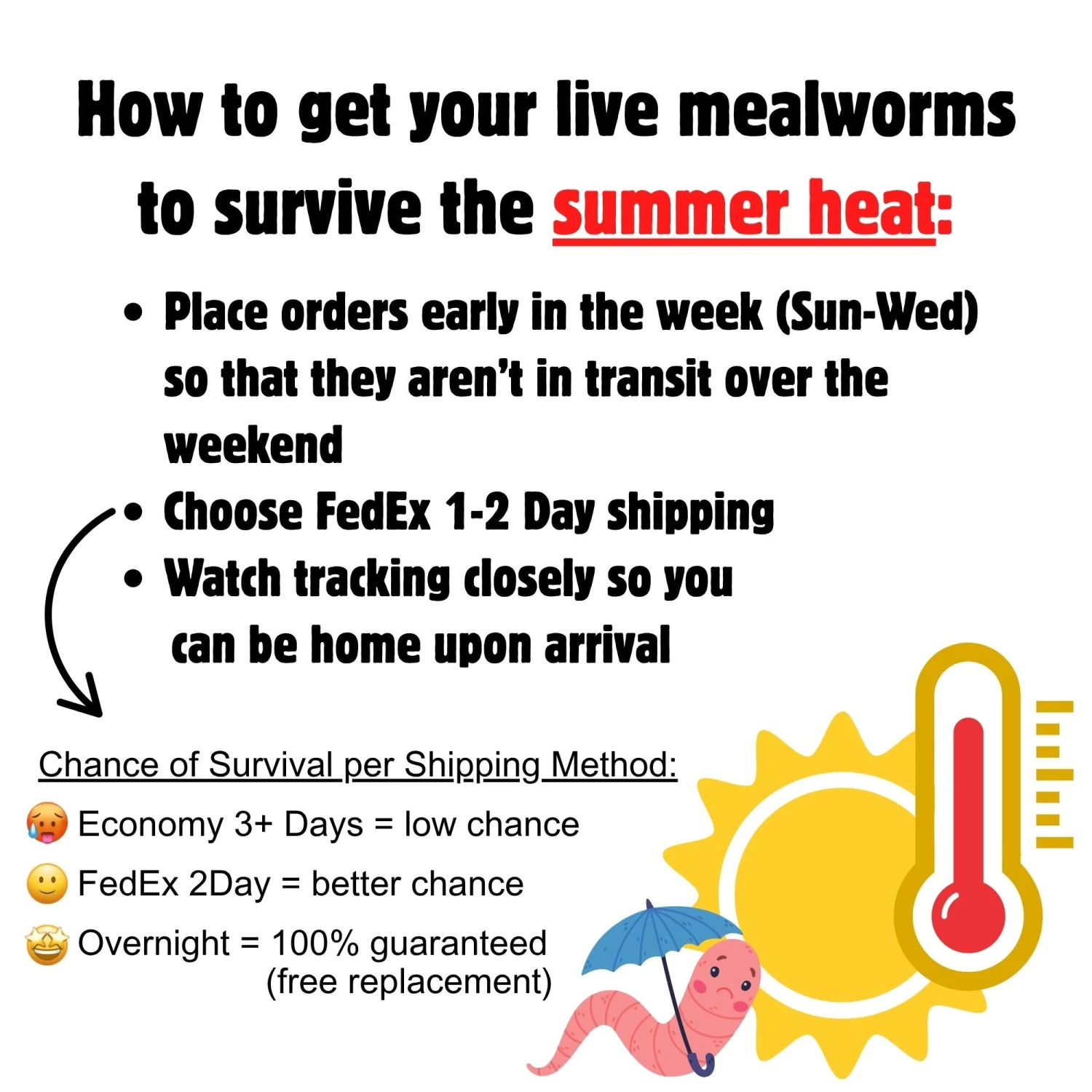 Live Mealworm Guarantee: Worms are insured if FedEx Priority Overnight shipping service is selected at checkout and the package is received upon delivery. If overnight shipping is not selected at checkout, the customer assumes all risk with no exceptions. View our full terms.