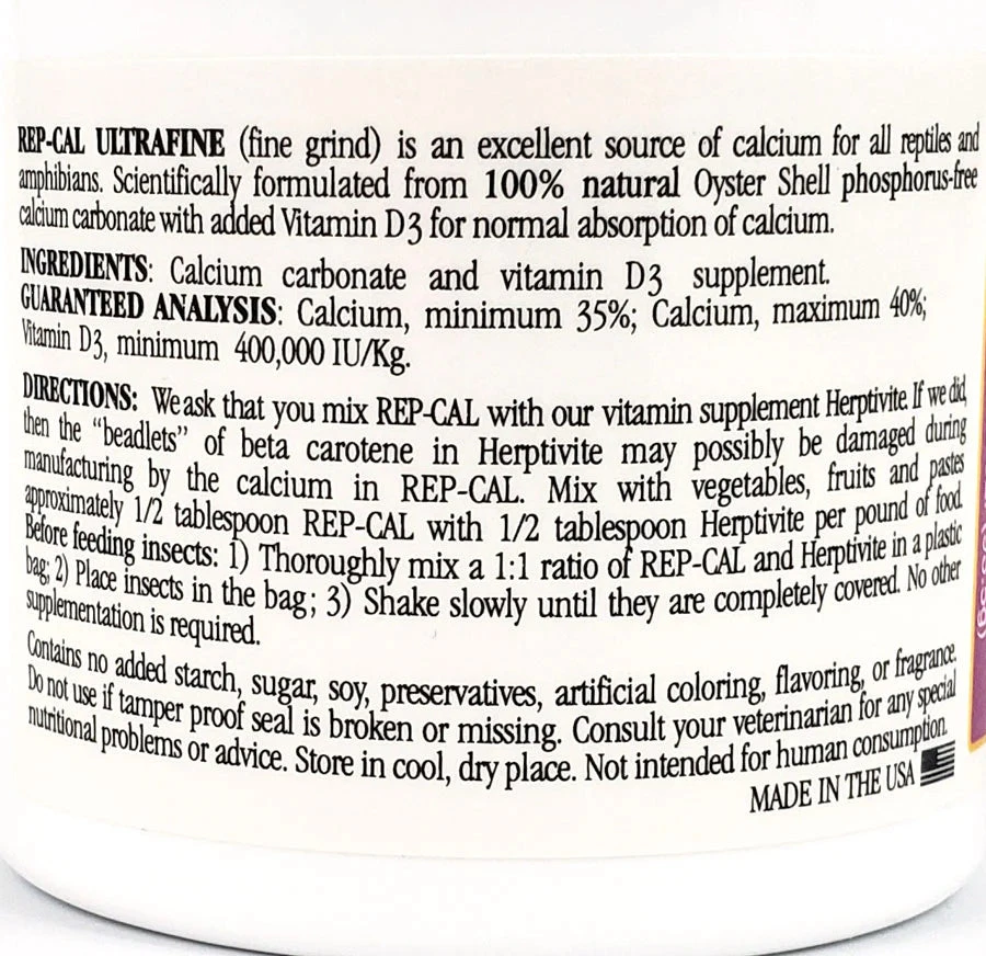 Rep-Cal Ultrafine Powder is an excellent source of calcium for all reptiles and amphibians. Scientifically formulated from 100% natural Oyster shell phosphorus-free calcium carbonate with added Vitamin D3 for normal absorption of calcium.
