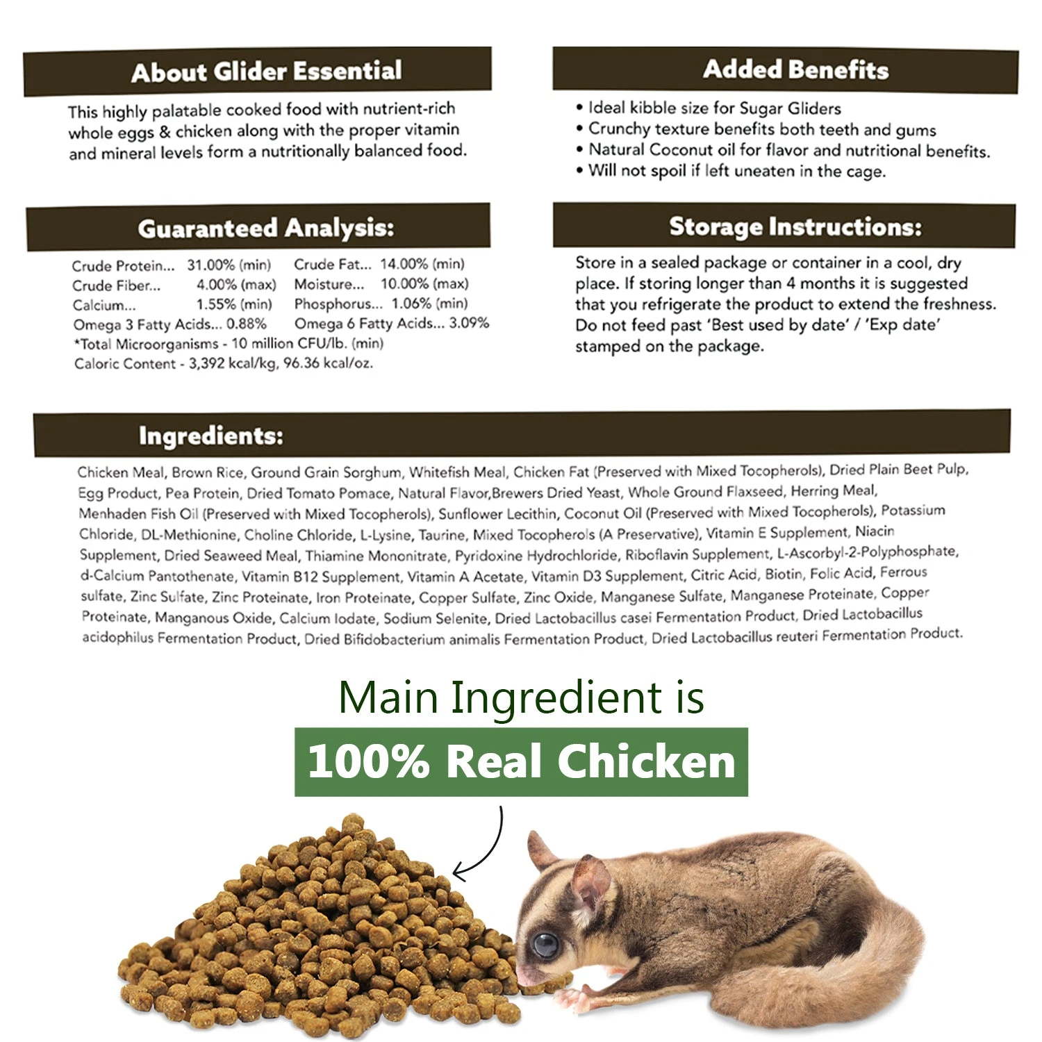 - ZooPro Glider Essential 1.75 lb. : A specially formulated, high-protein diet featuring nutrient-rich whole eggs, vitamins, and minerals to keep your glider healthy and happy.