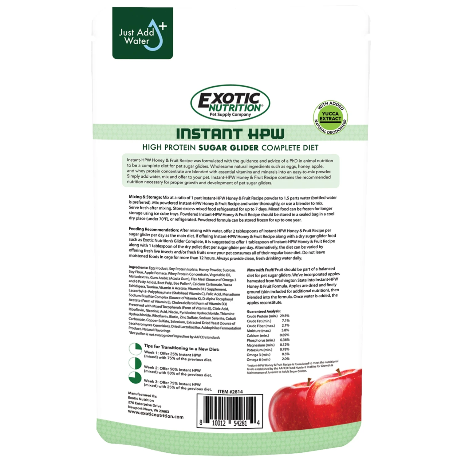 - Instant-HPW Honey & Fruit 8 oz. : A powdered sugar glider diet that transforms into a fresh, vanilla bean-flavored food when mixed with water – a delicious treat your glider will love.