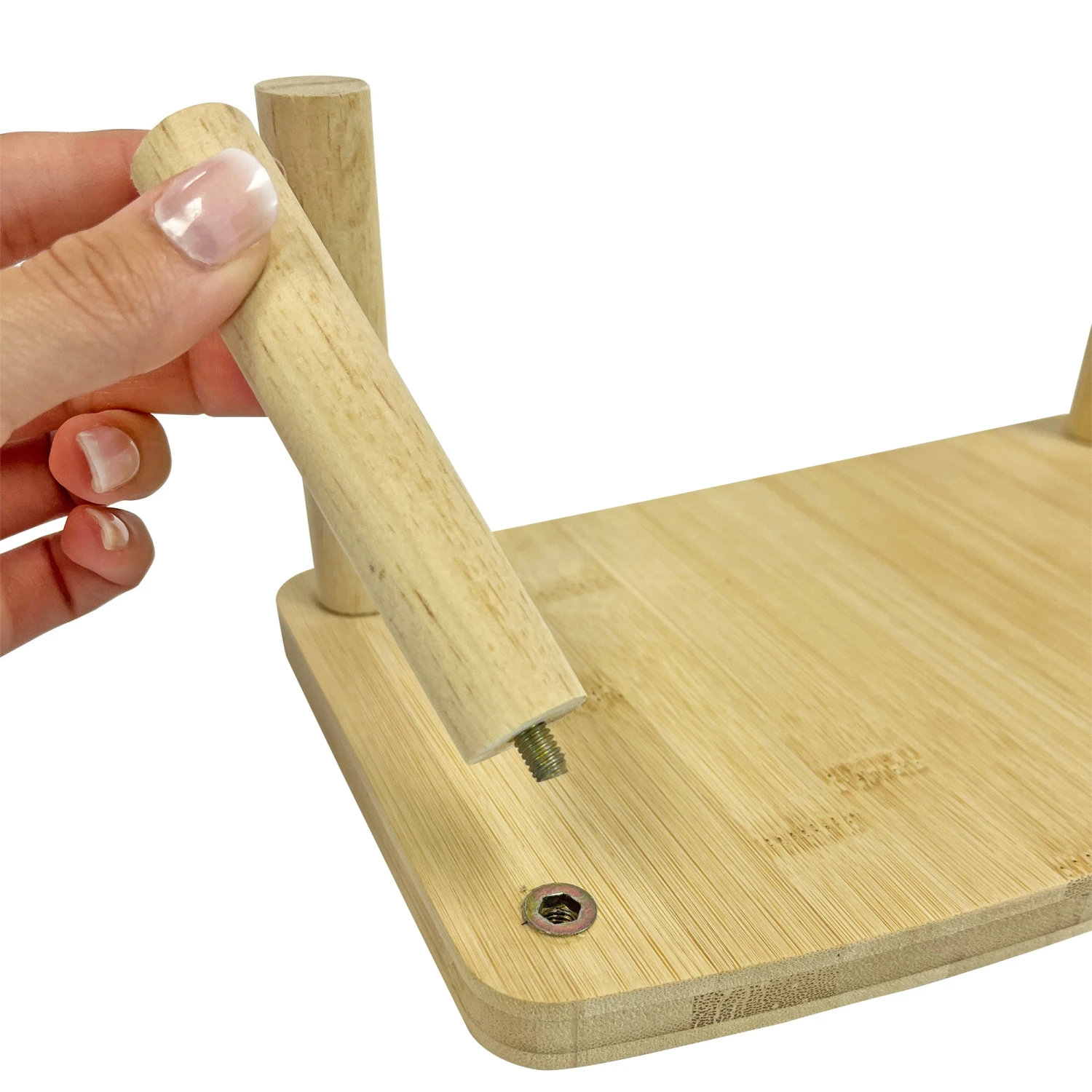 The NativeCritter Wheel Stand is an all-natural birch wood platform made to help create a stable area for Silent Runner exercise wheels to sit on. This durable stand is made with 100% pet safe materials. Simple screw in the four legs posts and your wheel stand is ready to use. It’s designed to fit into most pet habitats. Two sets of legs comes with each stand, one set shorter than the other so you can adjust the height to your liking.