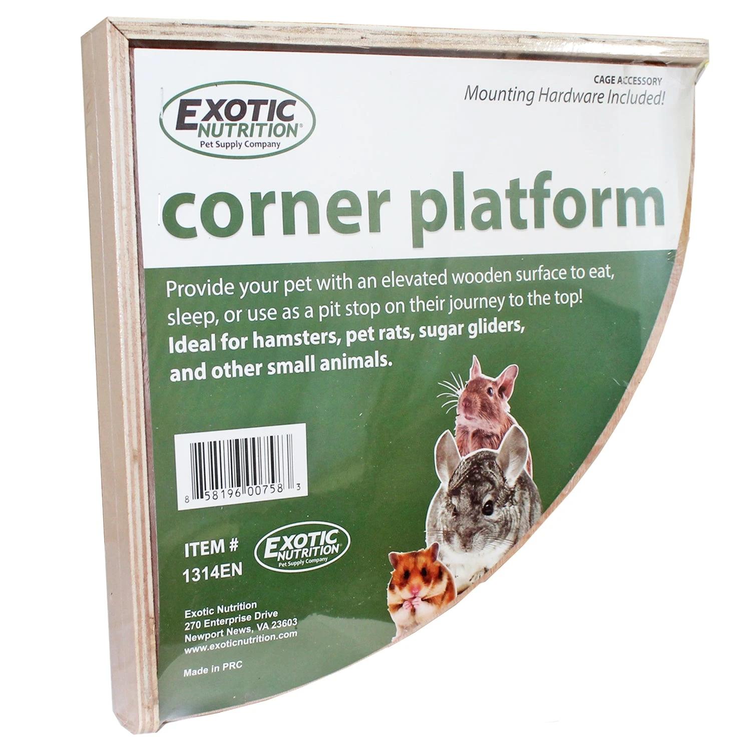 The Exotic Nutrition Wood Corner Platform satisfies your pet’s need to perch, jump & climb. Elevated surfaces help small pets feel safe while providing more surface area of floor space. Suggested for sugar gliders, rabbits, guinea pigs, prairie dogs, degus, chinchillas, rats, ferrets, birds, and other small animals.